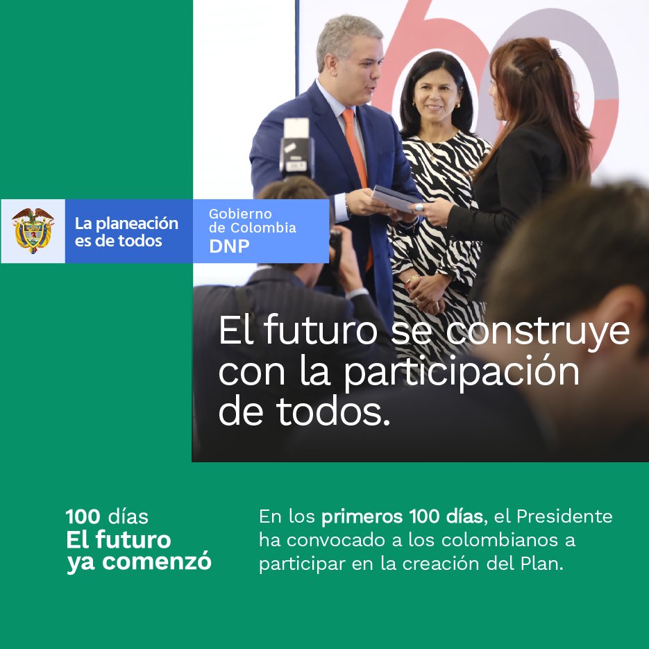 #Primeros100Días | El @DNP_Colombia entregó al @CNP_Col y a los distintos sectores de la economía, las Bases del Plan Nacional de Desarrollo para su socialización y discusión. Los colombianos han participado con sus ideas a través de http://pactoporcolombia.gov.co #ElFuturoYaComenzópic.twitter.com/ytvTM6cKhu