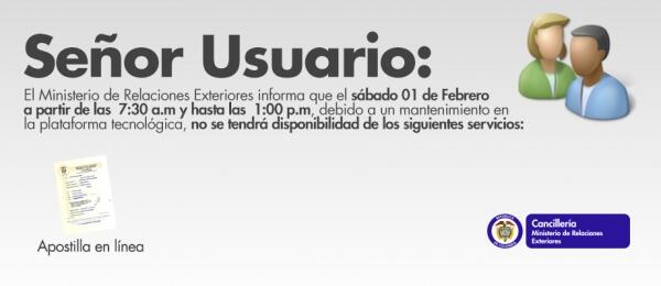 Atención: El sábado 1 de febrero algunos servicios en línea no estarán disponibles http://www.cancilleria.gov.co/newsroom/news/atencion-sabado-1-febrero-algunos-servicios-linea-no-estaran-disponibles#sthash.Vooj6l1i.dpuf …pic.twitter.com/7hgLrc1zJy