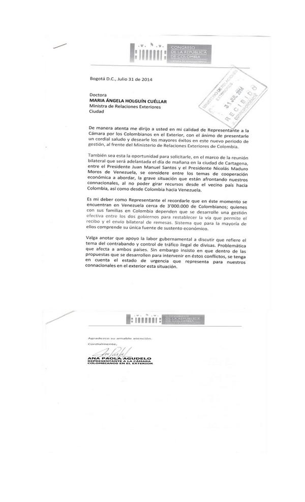 Hemos radicado ante @CancilleriaCol carta solicitando q mañana @JuanManSantos y @NicolasMaduro traten tema de Remesaspic.twitter.com/uLWmaZhgeW