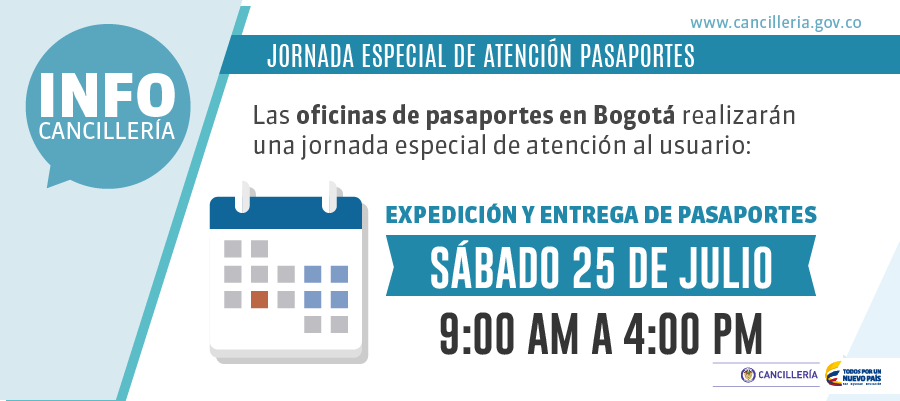 Estimado usuario: solicite su pasaporte en la jornada especial del sábado 25 de julio en Bogotápic.twitter.com/KEVbaQOIma