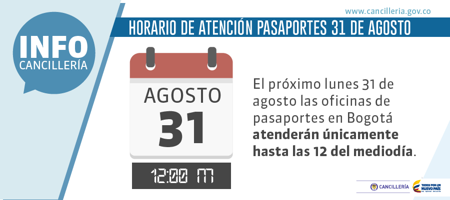 Si su pasaporte en Bogotá va a solicitar, no olvide que el 31 de agosto hasta las 12 m se atenderá.pic.twitter.com/GYNj5MuzKt