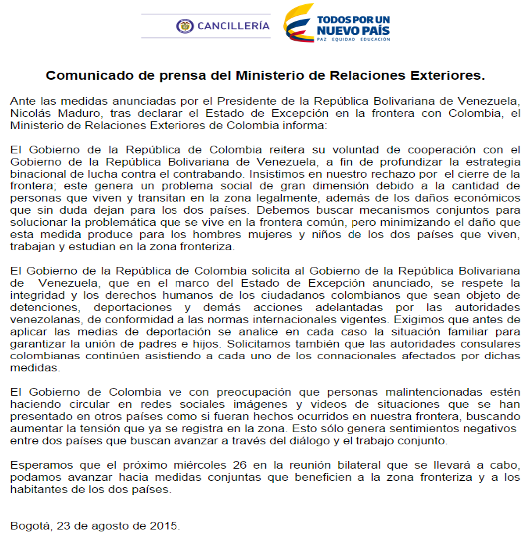 @dofc123 Rueda de prensa Canciller Holguín: http://goo.gl/aKp5ut Comunicado de prensa http://goo.gl/ftsuiU#Frontera#Venezuela