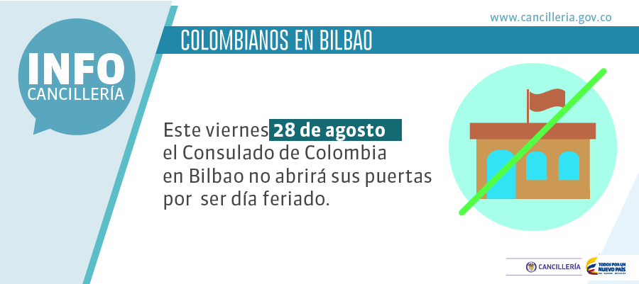 Respetados colombianos en Bilbao: el próximo viernes 28 de agosto no habrá atención del Consulado.pic.twitter.com/Ks7ou6iFTH