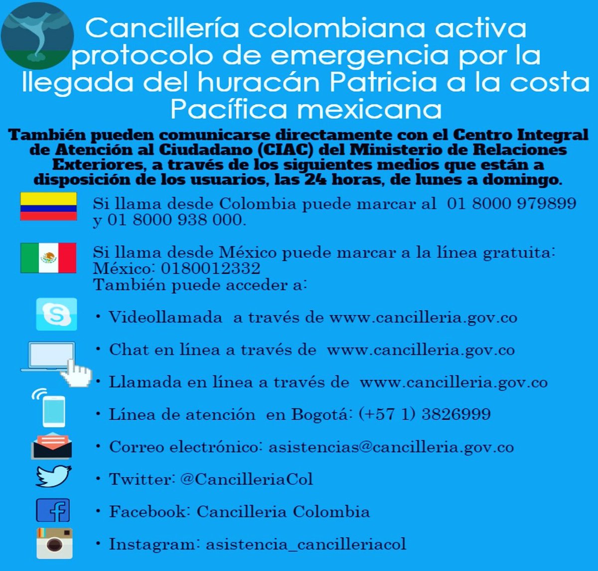 #ColombianosEnMexico @CancilleriaCol activó protocolo de emergencia por #HuracanPatriciapic.twitter.com/Y6WwCgn2jA