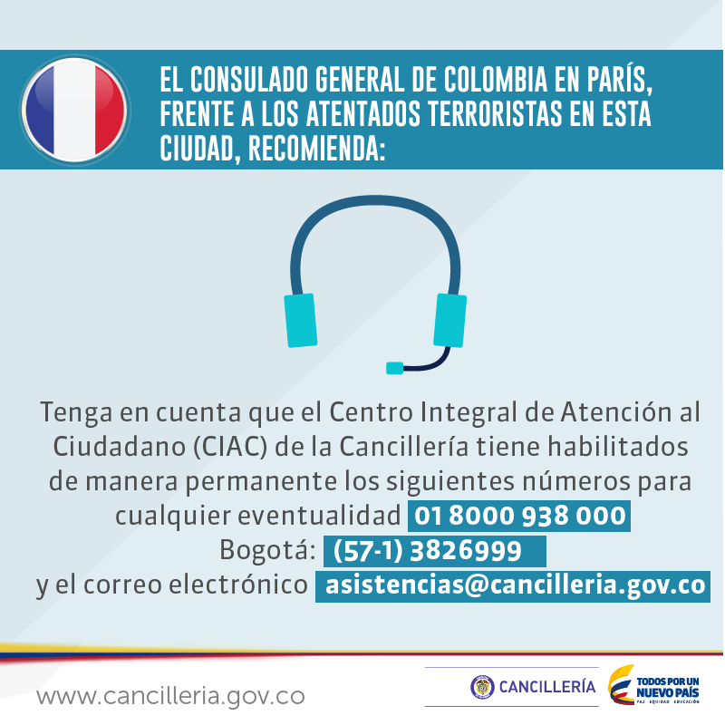#ColombianosEnParís Utilicen nuestros canales de atención al ciudadano en caso de eventualidadespic.twitter.com/186VJ6fkC7