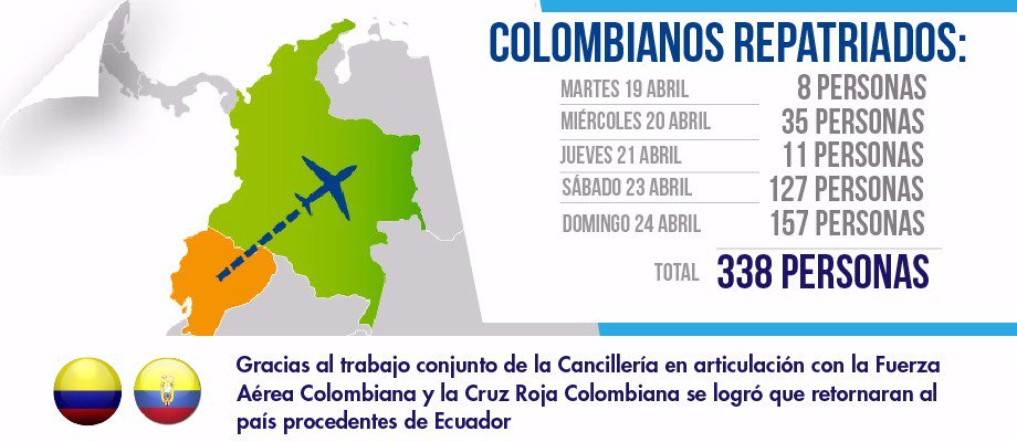 Hasta este domingo, 24 de abril, hemos repatriado 338 colombianos afectados por #SismoEcuadorpic.twitter.com/qdP4M7dKep