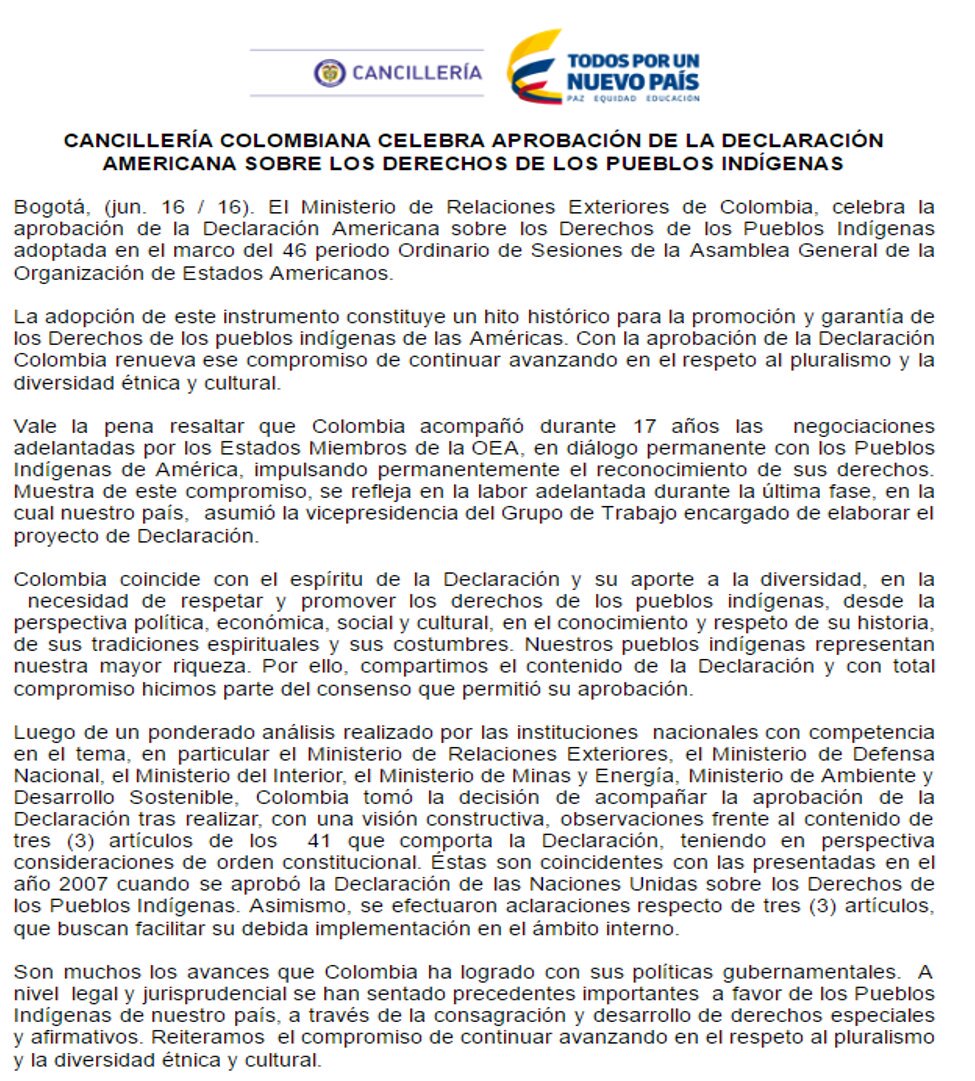 CANCILLERÍA COLOMBIANA CELEBRA APROBACIÓN DE LA DECLARACIÓN AMERICANA SOBRE LOS DERECHOS DE LOS PUEBLOS INDÍGENASpic.twitter.com/UQIbpSxcde