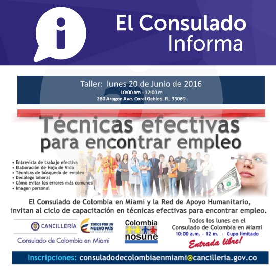 #ColombianosEnMiami Consulado realizará taller de técnicas efectivas para encontrar empleo http://goo.gl/prmtqd pic.twitter.com/5soKMj3Kdw