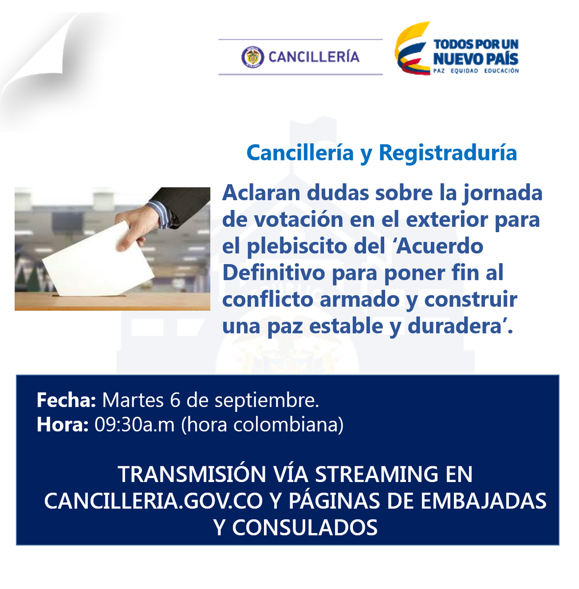 .@registraduria y @cancilleriacol explican este 6 de sept lo que debe saber sobre jornada de #PlebiscitoEnElExteriorpic.twitter.com/ICs30LzR4y