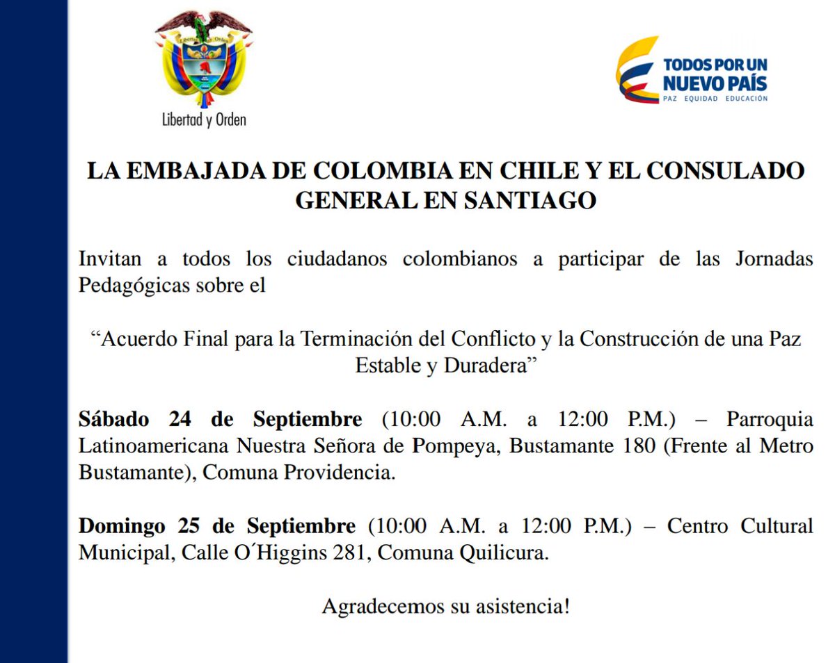 Jornada pedagógica sobre #AcuerdoDePaz para #ColombianosEnChile este 24 y 25 de septiembrepic.twitter.com/9VtR03eBha
