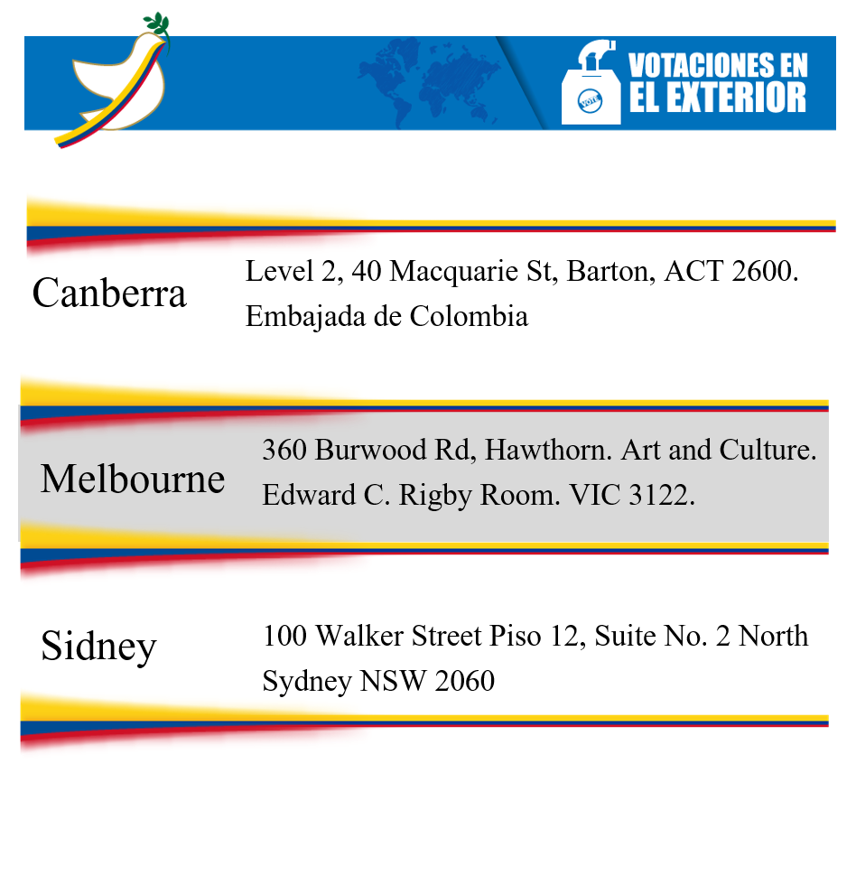 #ColombianosEnAustralia abiertas mesas de votación en Canberra, Melbourne y Sidney para que ustedes voten por #PlebiscitoEnElExteiorpic.twitter.com/UBuF2LPGTF