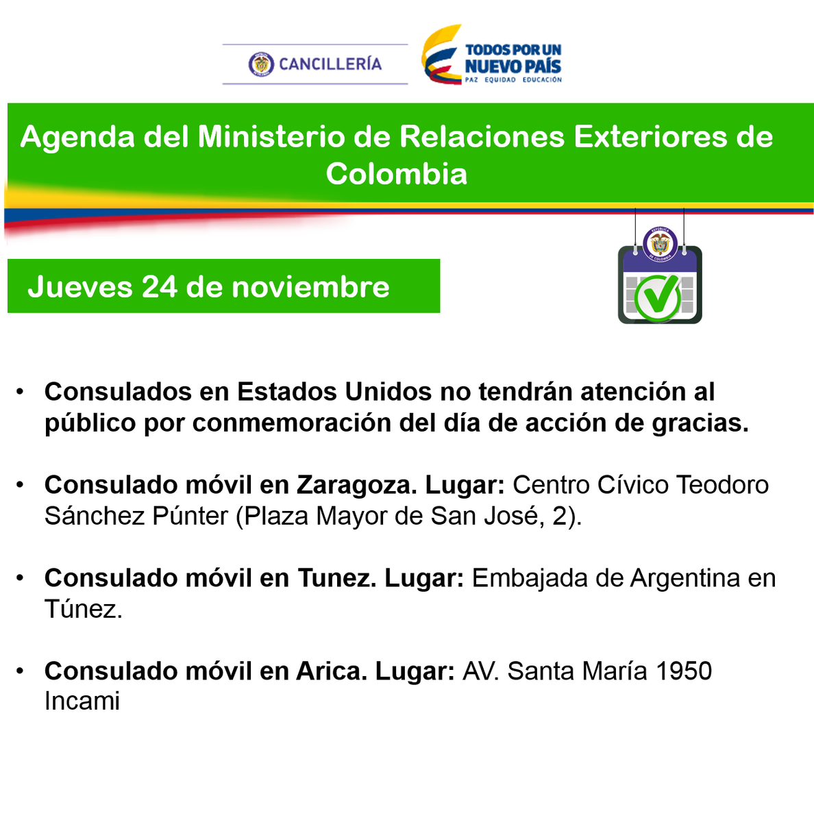 Conozca la agenda del Ministerio de Relaciones Exteriores para este 24 de noviembrepic.twitter.com/sVlT2jSDi1