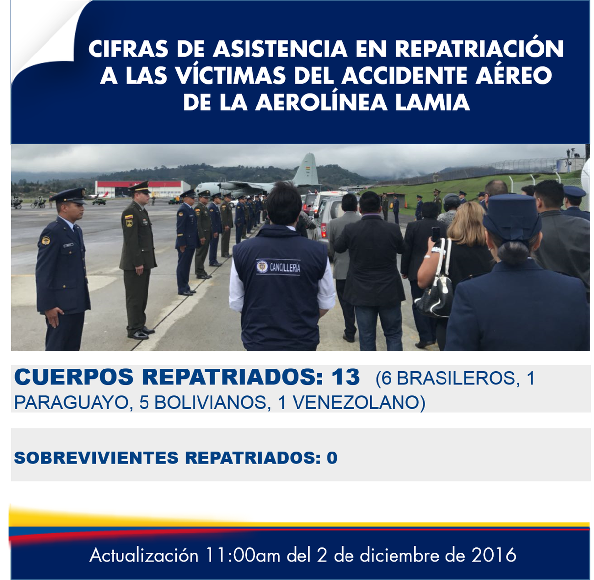 [Asistencias en repatriación a las víctimas del accidente del avión de la aerolínea LaMia, actualización 11:00am del 2 de diciembre de 2016]pic.twitter.com/3LcvyBWvq6