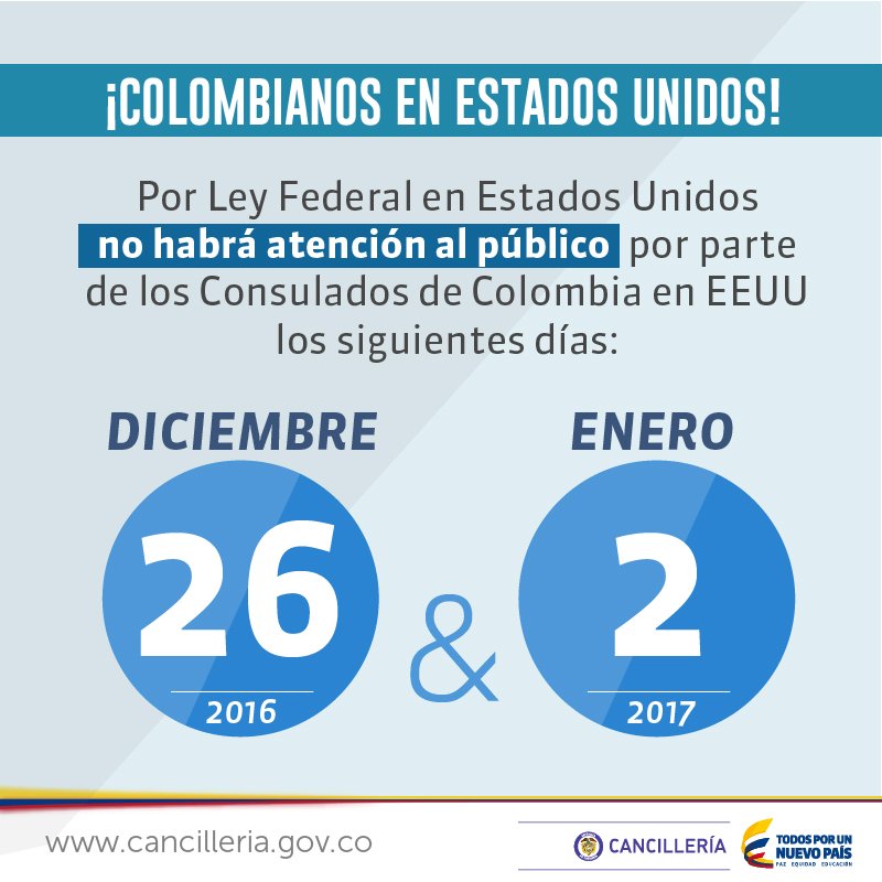Informamos que los consulados de Colombia no tendrán atención el próximo 26 de diciembre.pic.twitter.com/1MDfwjf3QB