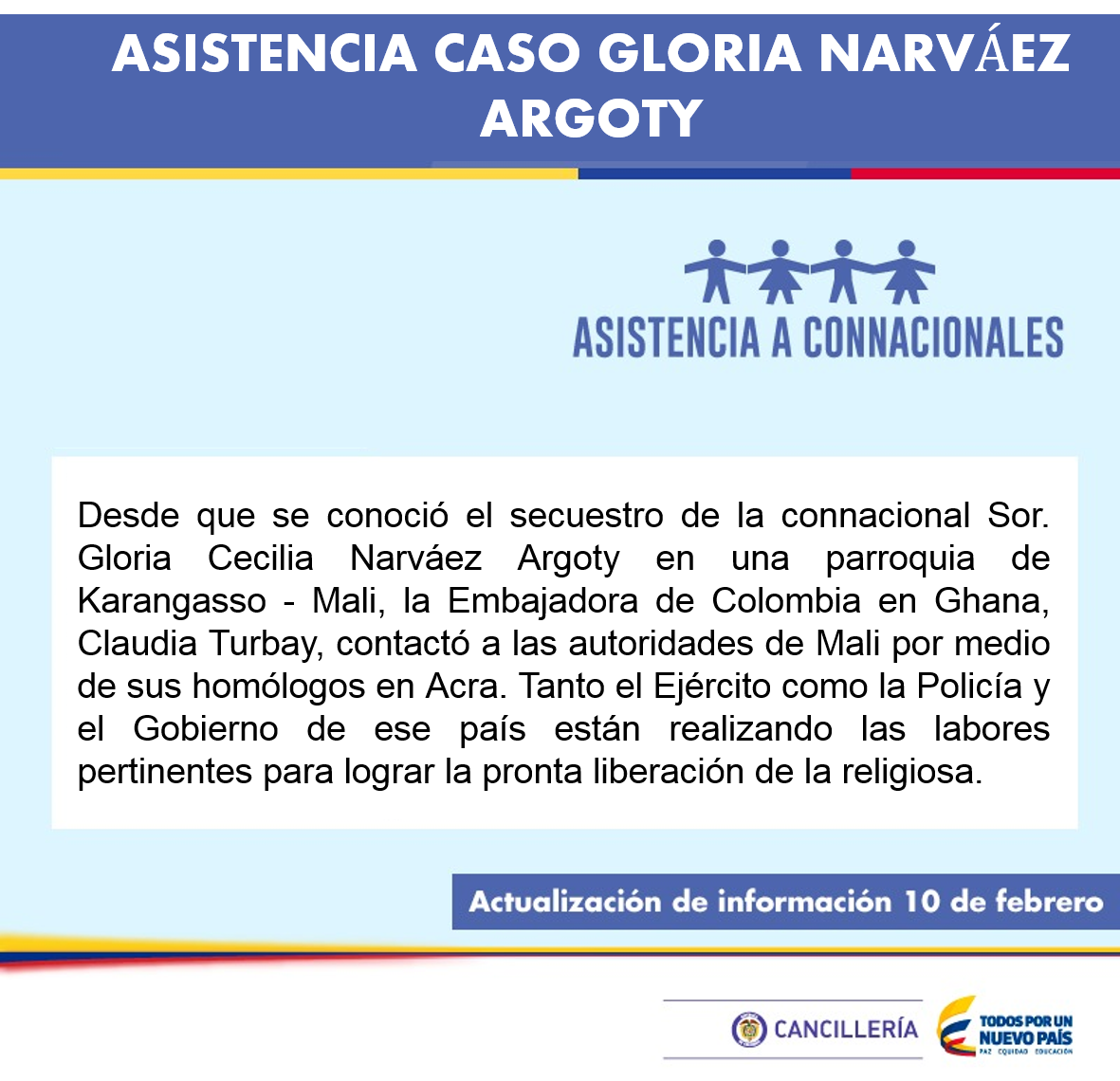 Desde que se conoció el secuestro de Sor Gloria Cecilia Narváez Argoty, la Embajadora en Ghana,Claudia Turbay,contactó a autoridades de Malipic.twitter.com/2trdr1pLGl