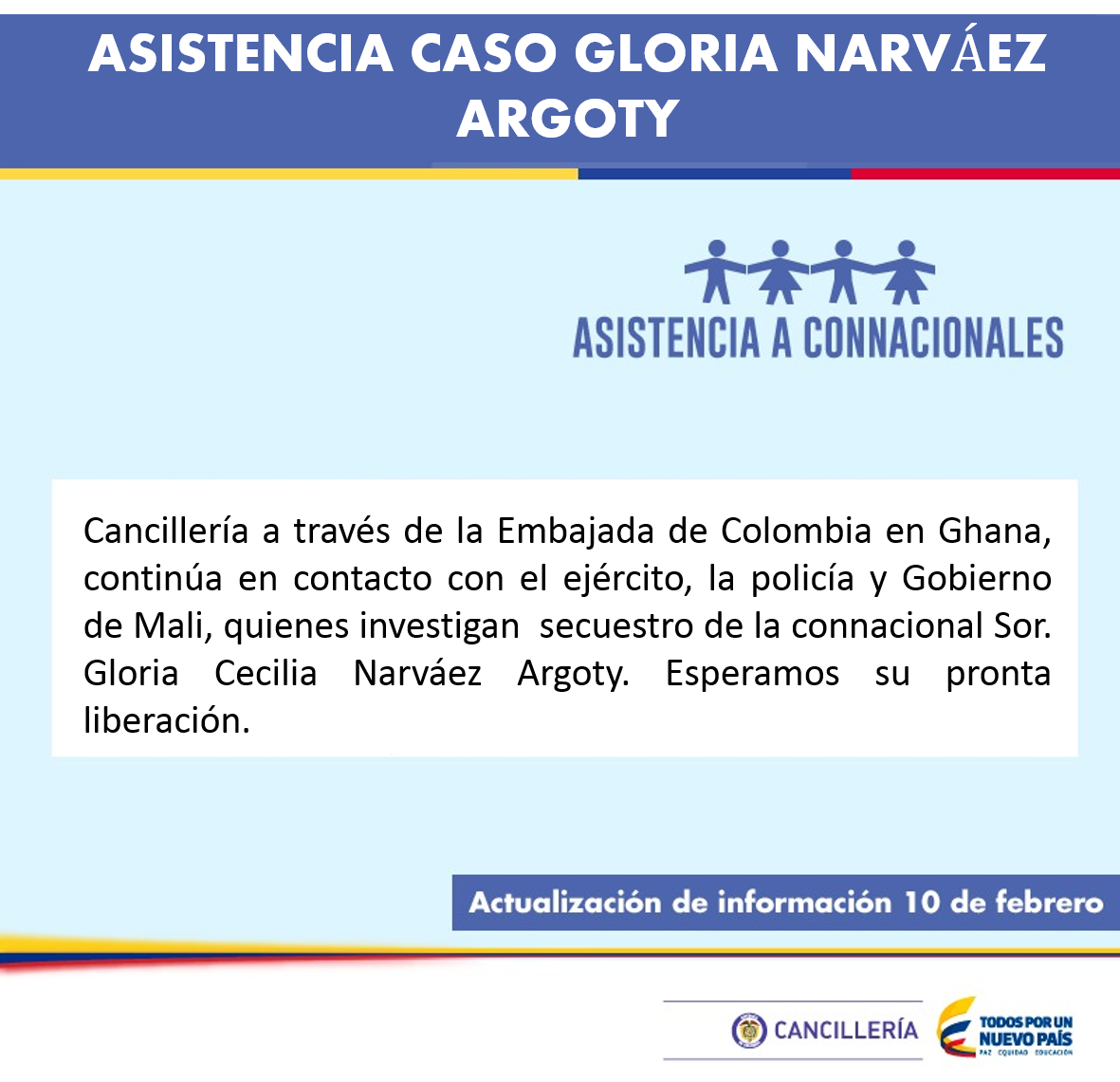 Cancillería continúa en contacto con ejército, policía y Gobierno de Mali, quienes investigan secuestro de Sor Gloria Cecilia Narváez Argotypic.twitter.com/eoVzdZKFvt