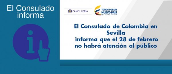 El Consulado de Colombia en Sevilla informa que el 28 de febrero no habrá atención al público http://sevilla.consulado.gov.co/newsroom/news/2017-02-21/13436 …pic.twitter.com/GnfiMGmhR8