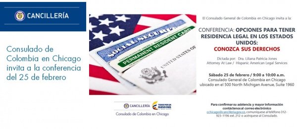 Conferencia para #ColombianosEnCHicago “Opciones para tener residencia legal en los Estados Unidos: conozca sus derechos” este 25 de febreropic.twitter.com/3XehpBnU3Z