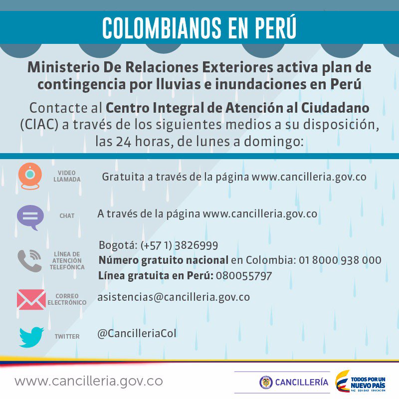 Consulados en #Perú activan plan de contingencia para asistir a colombianos que puedan verse afectados por inundaciones en ese paíspic.twitter.com/XQbOxjlQqW