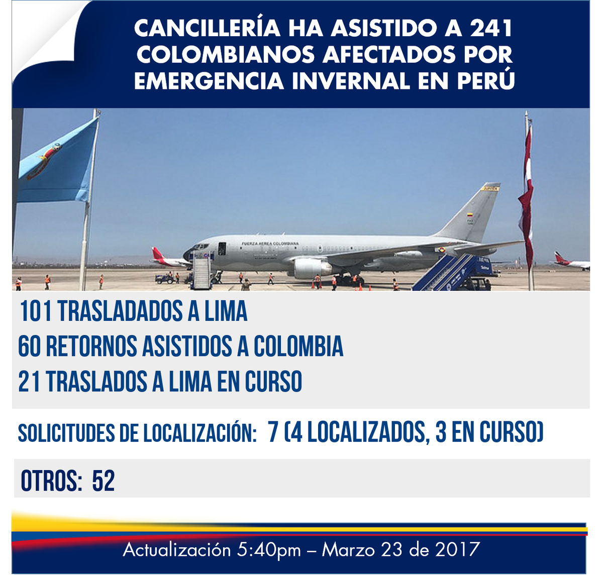 Cancillería ha asistido a 241 colombianos afectados por emergencia invernal en Perúpic.twitter.com/SxXki9Njaj