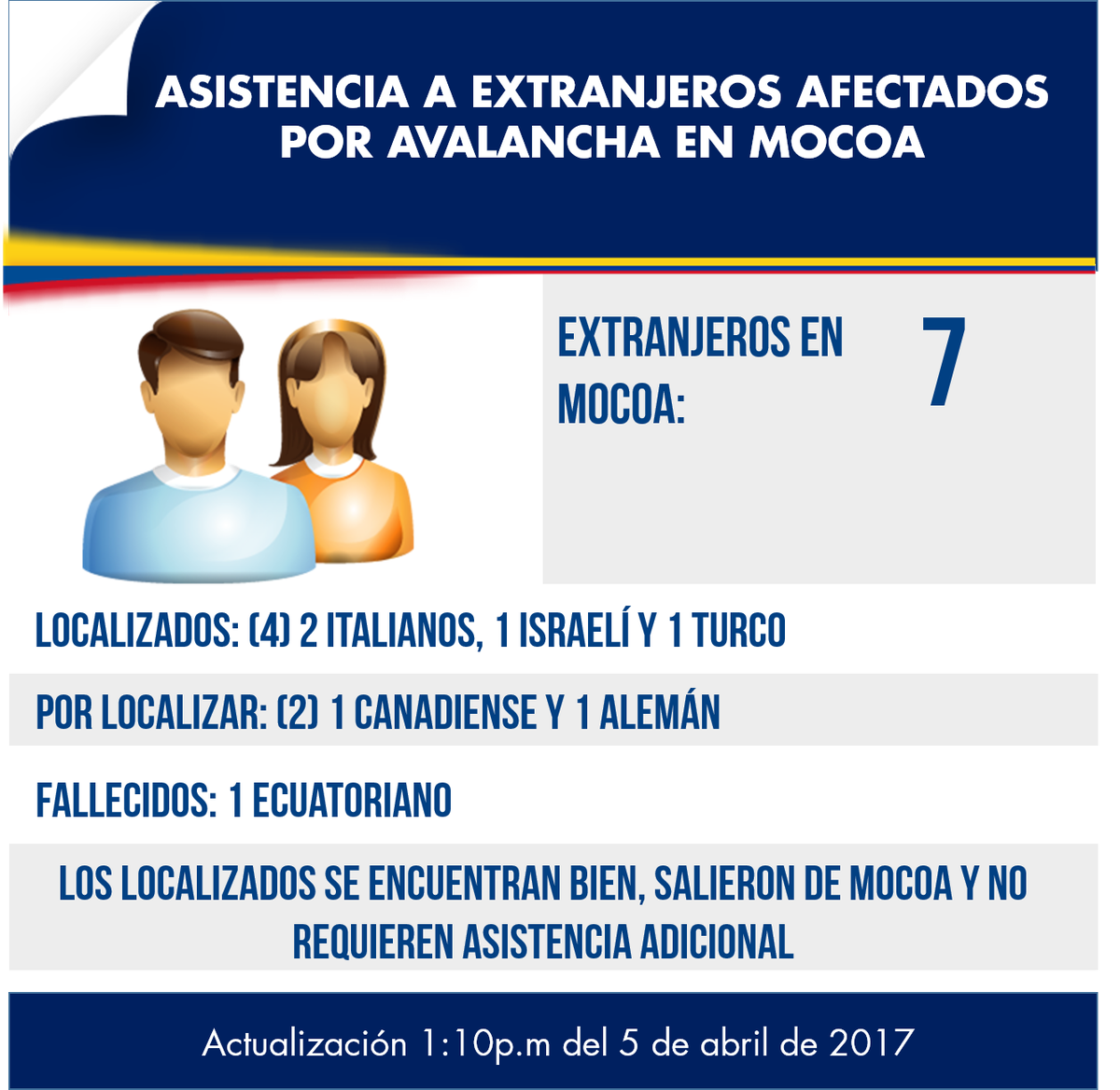 #MocoaSeLevanta Asistencia a extranjeros afectados por avalancha en Mocoa – Actualización 1:10pm del 5 de abril de 2017pic.twitter.com/cjQJ3LonB9