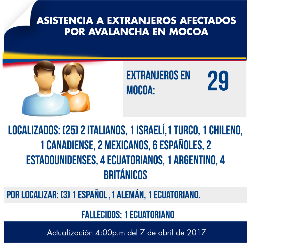 #Vamosmocoa Asistencia a extranjeros afectados por avalancha en Mocoa – Actualización 4:00pm del 7 de abril de 2017pic.twitter.com/bzi95GI2wz