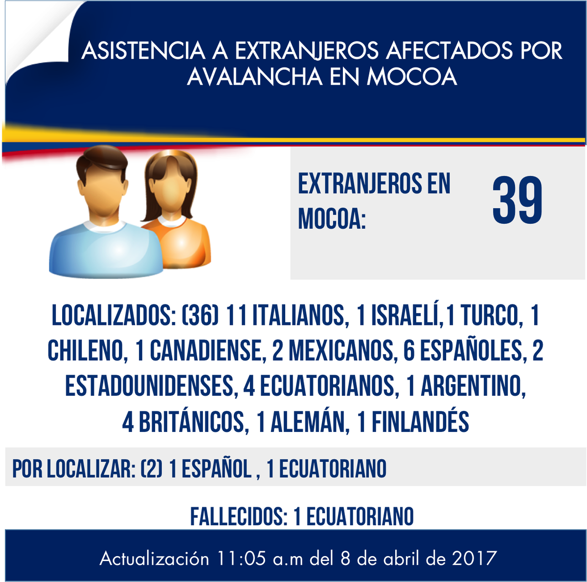 #VamosMocoa Asistencia a extranjeros afectados por avalancha en Mocoa – Actualización 11:05 am del 8 de abril de 2017pic.twitter.com/ERL7Qupyhs