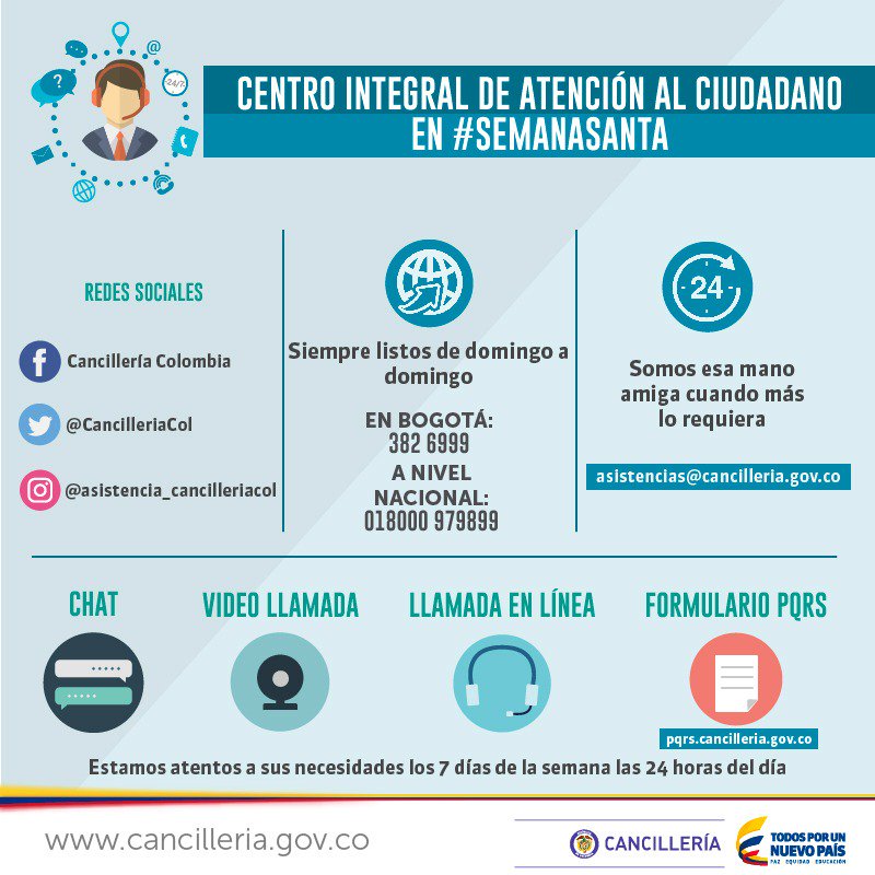 En #SemanaSanta colombianos en el exterior pueden ponerse en contacto con Cancillería a través del Centro Integral de Atención al Ciudadanopic.twitter.com/BkphPjfj7r