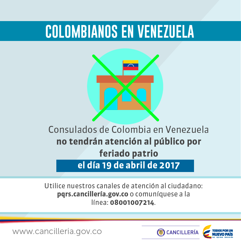 #ColombianosEnVenezuela mañana 19 de abril NO habrá atención al usuario en Consulados por feriado patrio #CancilleriaParaTodospic.twitter.com/gtmM455Ild