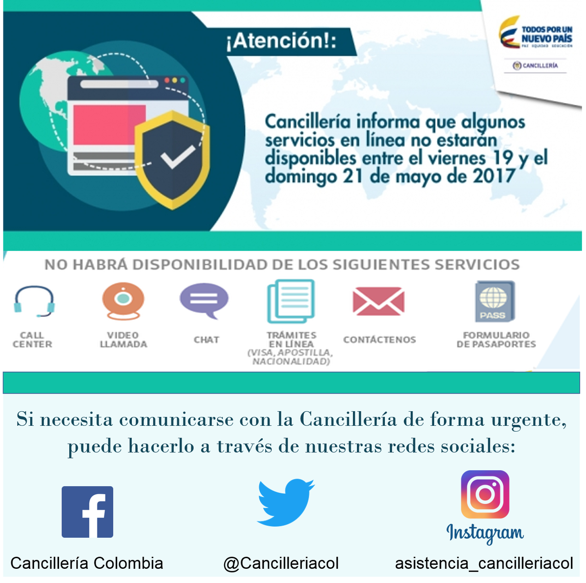¡Atención! algunos de nuestros servicios en línea no estarán disponibles entre el viernes 19 y el domingo 21 de mayo http://www.cancilleria.gov.co/newsroom/news/atencion-cancilleria-informa-algunos-servicios-linea-no-estaran-disponibles-viernes-19 …pic.twitter.com/l5K1CripB2