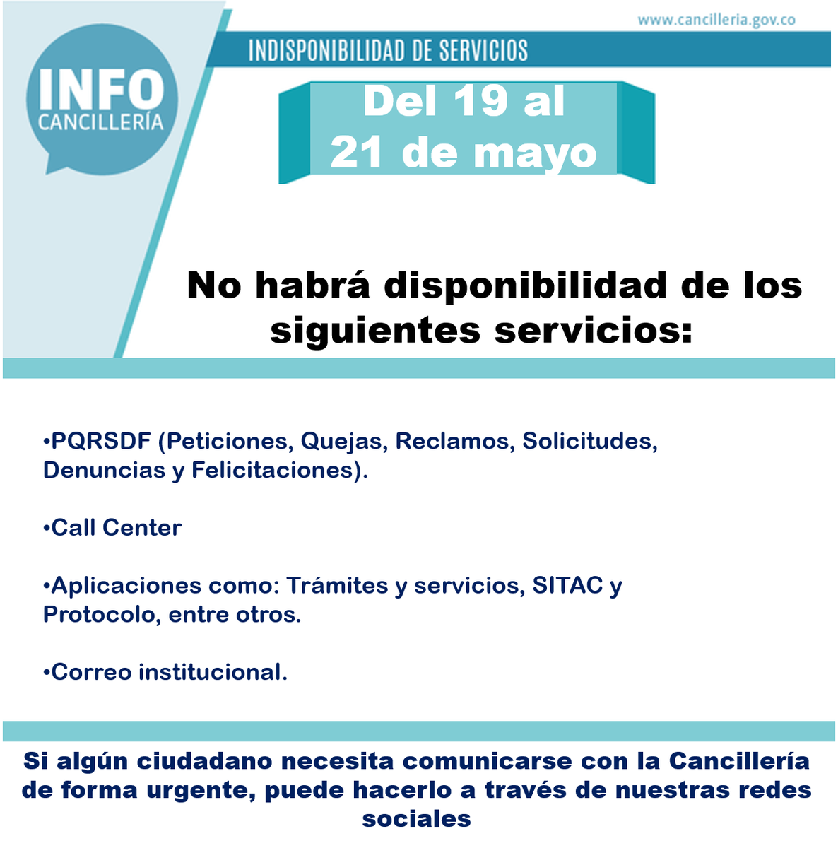 Por acciones de mejora tendremos indisponibilidad de servicios del 19/05 a las 7pm al 21/05 a las 12pm. Contáctenos a través de este mediopic.twitter.com/bcsyKI3PYh