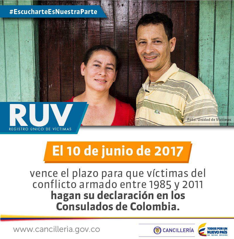 Quedan 15 días para que #ColombianosEnElExterior víctimas del conflicto (de 1985 a 2011) sean parte del RUV. Declare en nuestros Consuladospic.twitter.com/hoM54f0jAs