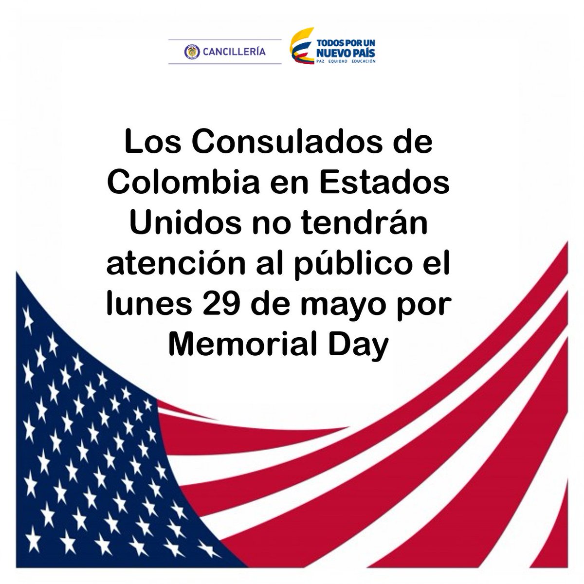 El lunes 29 de mayo, Consulados de Colombia en Estados Unidos no tendrán atención al público debido a Memorial Daypic.twitter.com/AWxJ0RdlJP
