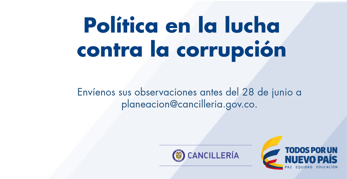 Nuestra Política en la lucha contra la corrupción será actualizada, por eso queremos conocer sus observaciones. http://www.cancilleria.gov.co/plan-anticorrupcion-y-atencion-al-ciudadano …pic.twitter.com/X2aATIgcln