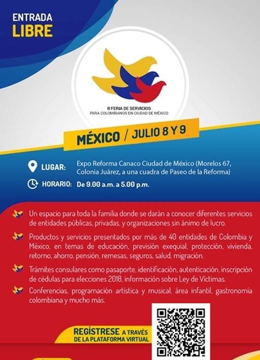 Colombiano, participe este 8 y 9 de julio en la II Feria de Servicios para colombianos en México. Más información en http://mexico.consulado.gov.co/node/news/14230/entidades-colombianas-y-mexicanas-participaran-la-feria-servicios-colombianos-mexico …pic.twitter.com/abQSF3CnEU