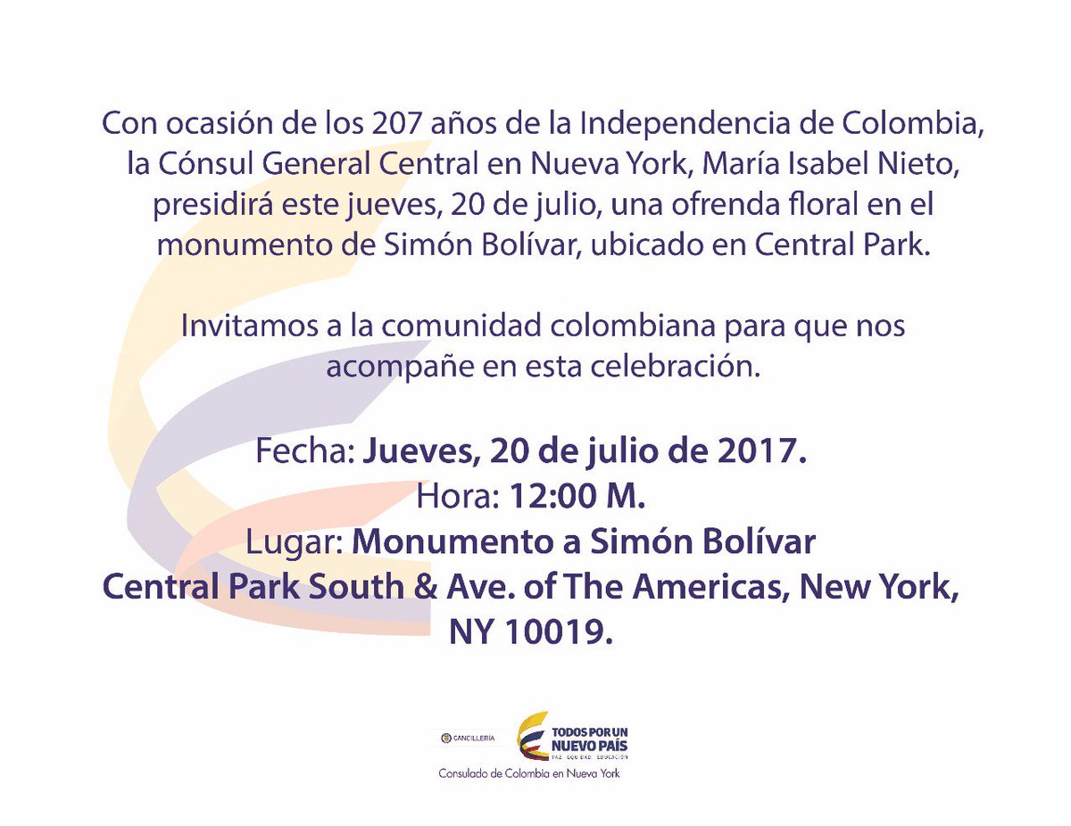 En Nueva York, el Consulado conmemorará los 207 años de Independencia de COL este 20 de julio con una ofrenda floral y un acto cultural.pic.twitter.com/9fLXyHQrij