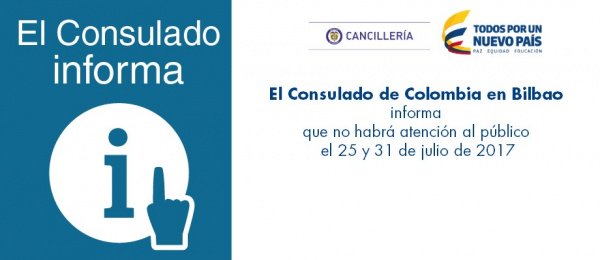 No habrá atención al público el 25 y 31 de julio de 2017 en el Consulado de Colombia en Bilbao http://bilbao.consulado.gov.co/newsroom/news/2017-07-21/14340 …pic.twitter.com/YthvbbRPvA