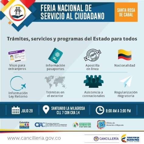 Sr usuario el próximo 29 de julio estaremos en #SantaRosaDeCabal brindando información sobre los siguientes tramites #CancilleriaEnRisaraldapic.twitter.com/4qeZI55Fb3