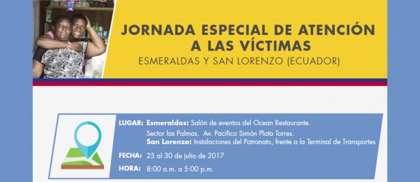 Del 25 al 30 de julio: jornada especial de atención a víctimas en Esmeraldas y San Lorenzo (Ecuador) http://ecuador.embajada.gov.co/newsroom/news/2017-07-24/12152 …pic.twitter.com/PqpWxxIwHo