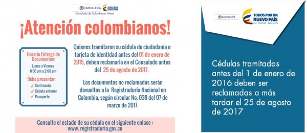 #ColombianosEnMiami Cédulas tramitadas antes del 01/01/2016 deben ser reclamadas a más tardar el 25 de agosto http://miami.consulado.gov.co/newsroom/news/2017-07-25/14370 …pic.twitter.com/vg9ZDXeVef