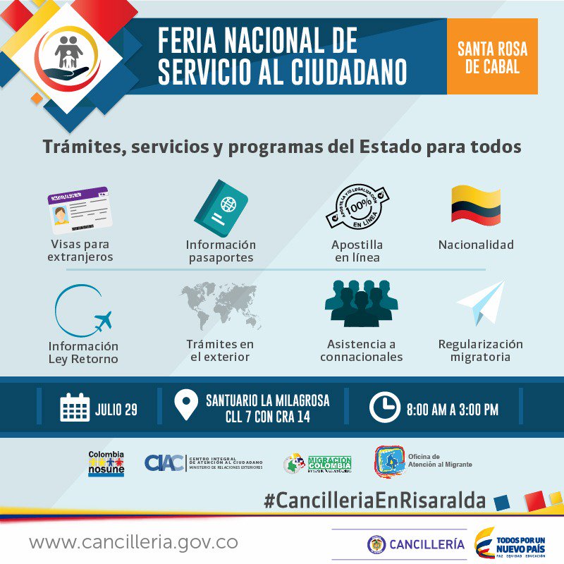 Sr usuario recuerde que hoy 29 de julio estaremos en #SantaRosaDeCabal en feria nacional de servicios donde encontrará información sobre:pic.twitter.com/h8hGWdWyxY