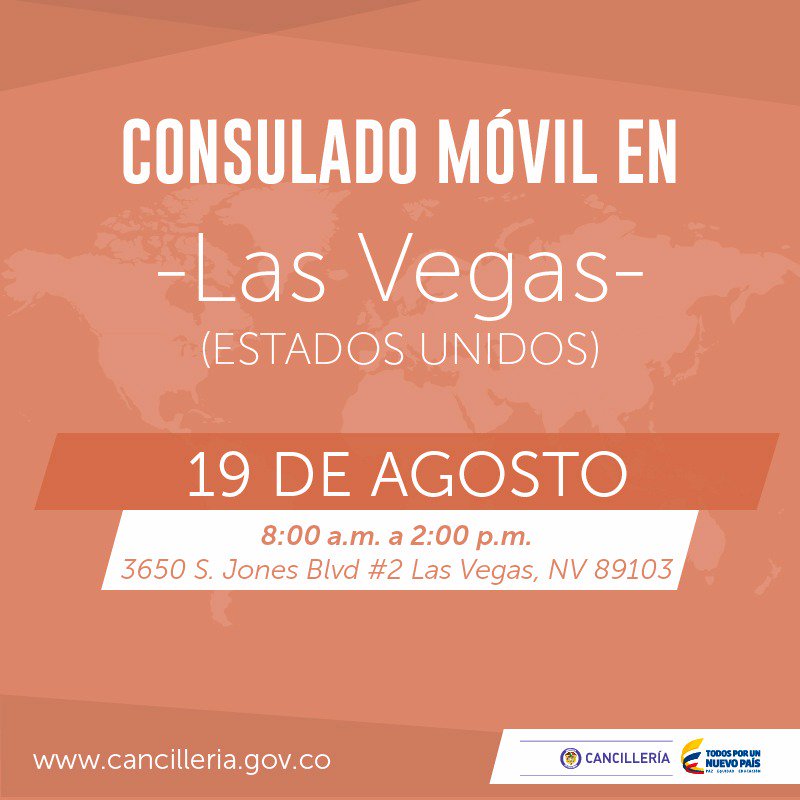 #Atención colombianos en Las Vegas, se realizará jornada de Consulado Móvil el sábado 19 de agosto #CancilleriaParaTodospic.twitter.com/EO7vyQbVpF