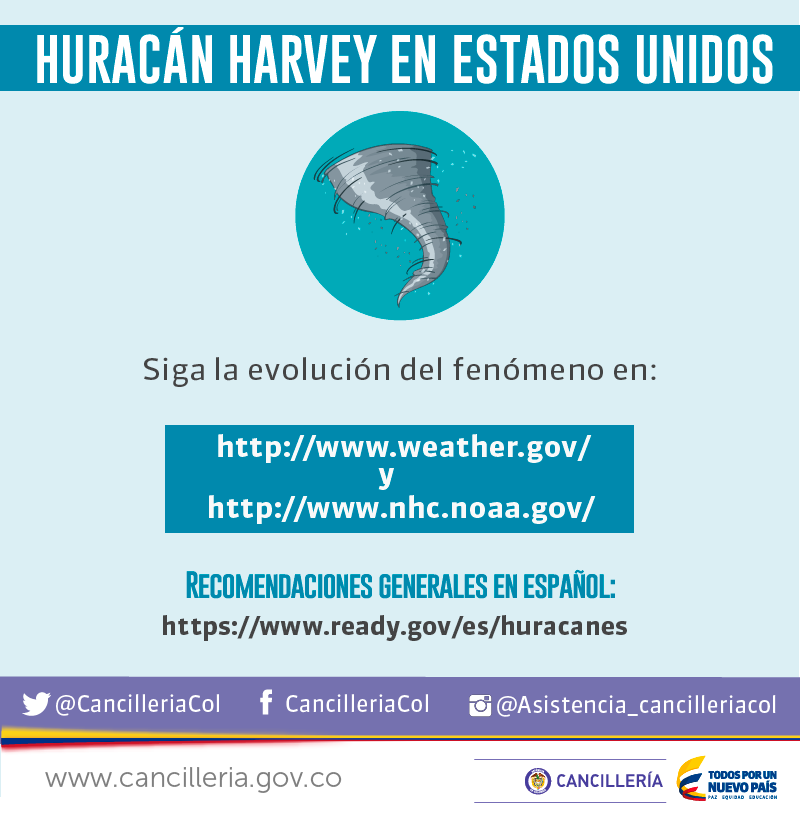 #ColombianosEnEstadosUnidos Monitoree el avance del huracán Harvey por los medios locales, manténgase al tanto de la situaciónpic.twitter.com/LoUJfnRYqX