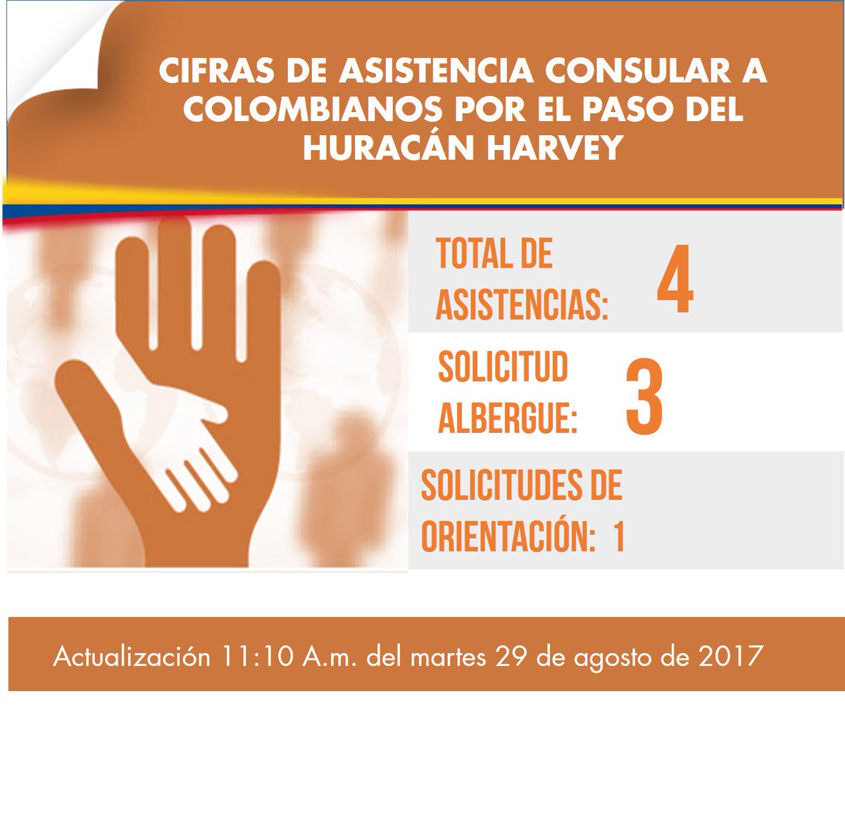 Asistencias a Colombianos afectados por el paso del huracán Harvey [Reporte 11:10 a.m. del 29 de agosto de 2017]pic.twitter.com/QQYgFRgCAB