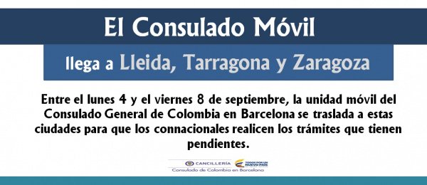 El #ConsuladoMóvil se traslada desde Barcelona a Lleida, Tarragona y Zaragoza, del 4 al 8 de septiembre http://barcelona.consulado.gov.co/newsroom/news/2017-08-22/14564 …pic.twitter.com/YlhbQ5kBs6