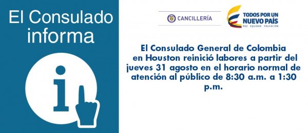 Consulado en Houston reinició labores a partir del jueves 31 ago en horario normal de atención de 8:30 am a 1:30 pm http://houston.consulado.gov.co/newsroom/news/2017-08-30/14606 …pic.twitter.com/4GaUKzEmNQ