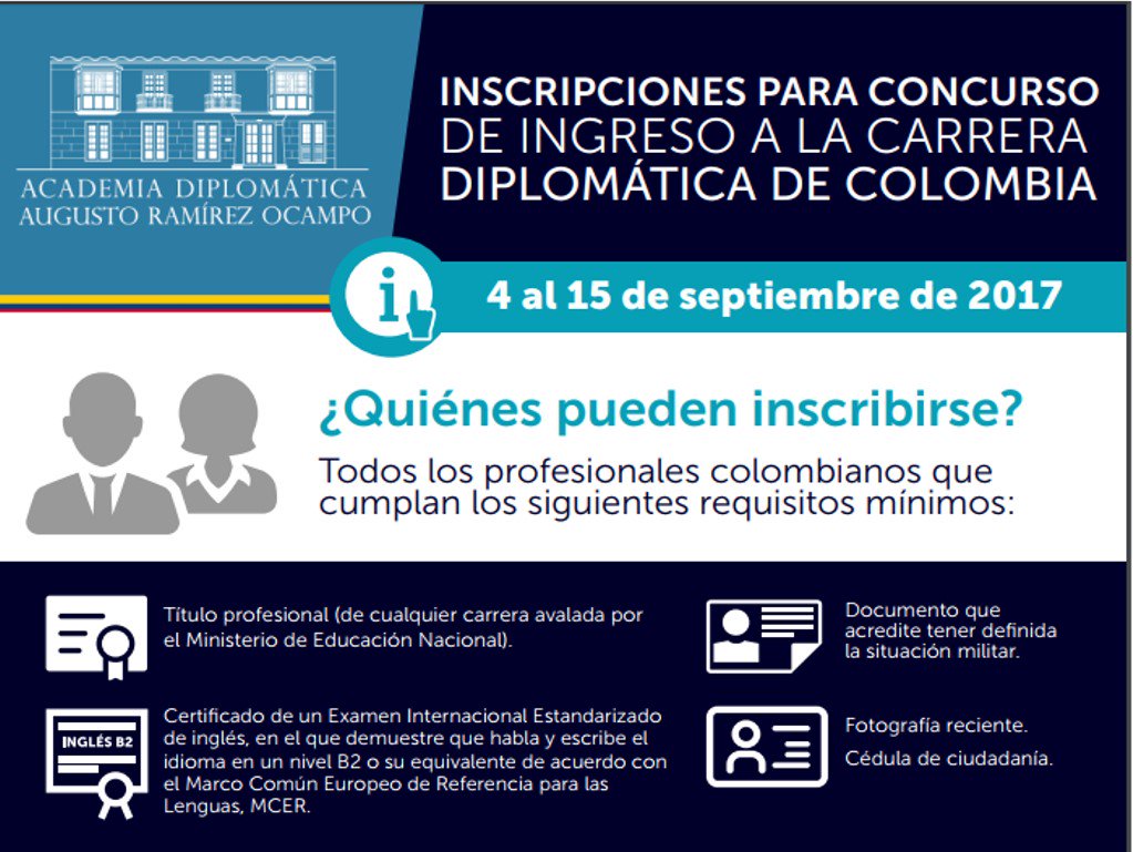Ya están abiertas las inscripciones para que haga parte del servicio diplomático colombiano. Ingrese a http://academia.cancilleria.gov.co/aspirante/registrarSolicitud.aspx …pic.twitter.com/6weH2U5rdw