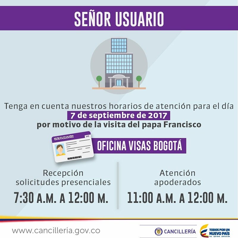 Sr. usuario, si va a tramitar visa colombiana tenga en cuenta la siguiente información para el próximo 7 de septiembre. #ModoPapapic.twitter.com/GWspxR75ra