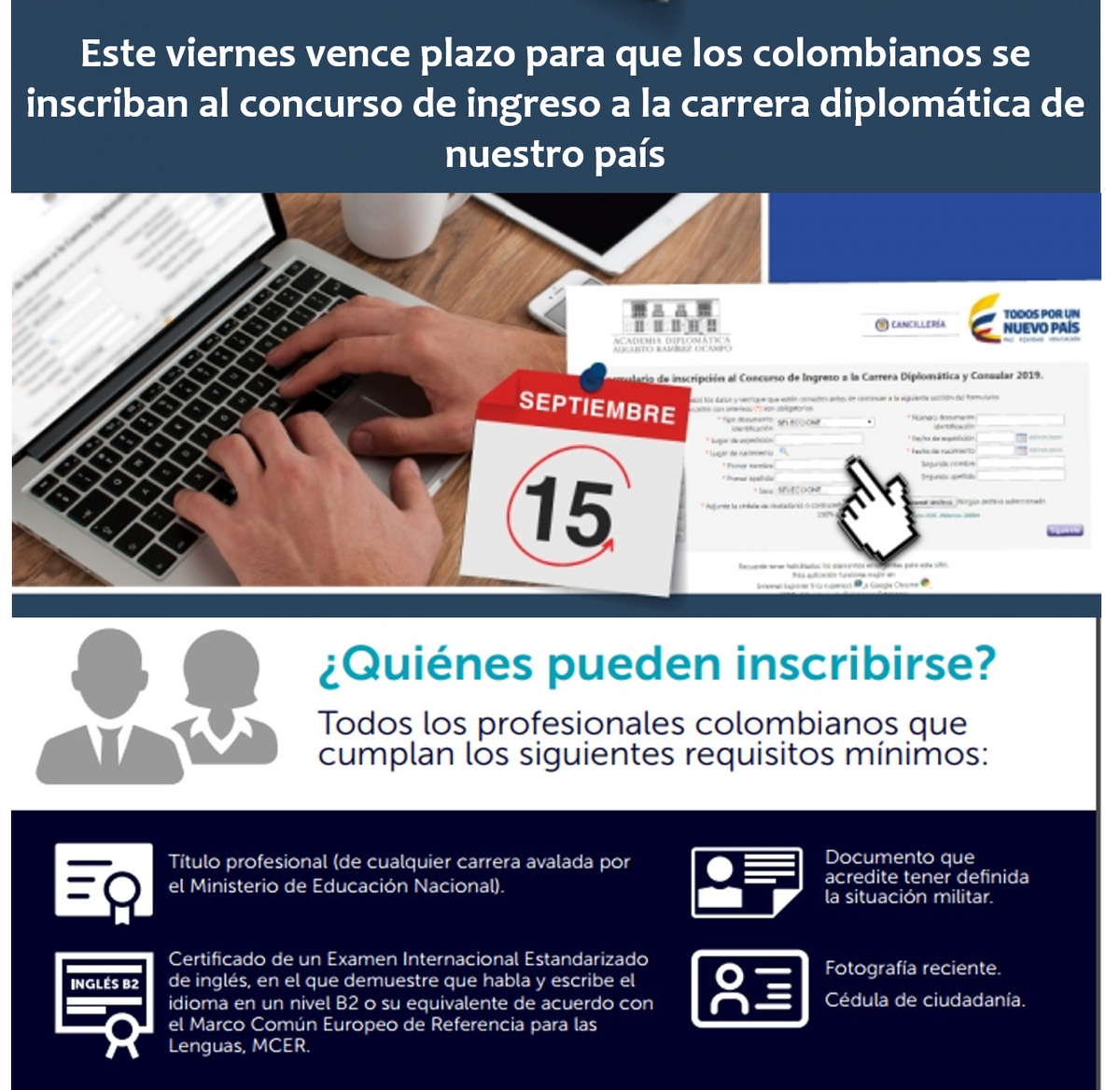 Hasta el 15 de septiembre puede completar su inscripción al Concurso de Ingreso a la #CarreraDiplomática http://www.cancilleria.gov.co/newsroom/news/viernes-vence-plazo-colombianos-inscriban-concurso-ingreso-carrera-diplomatica-pais …pic.twitter.com/cYufUgD7CO