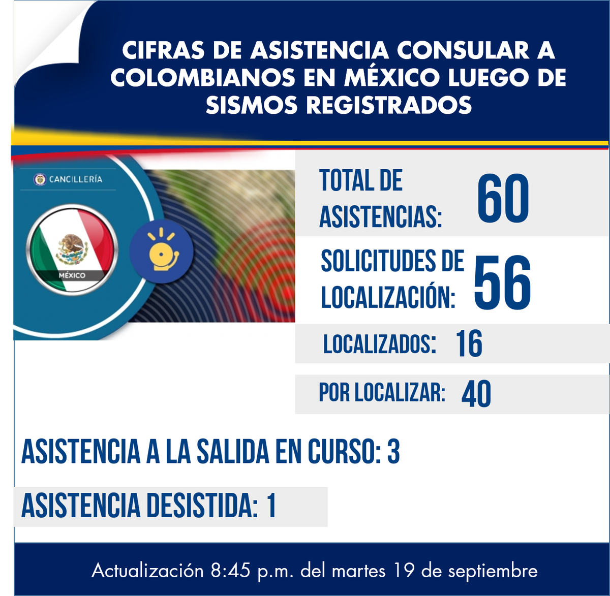 Asistencia consular a #ColombianosEnMéxico luego de sismos registrados [Reporte 8:45p.m. del 19 de septiembre de 2017]pic.twitter.com/pPlLyCgfPZ